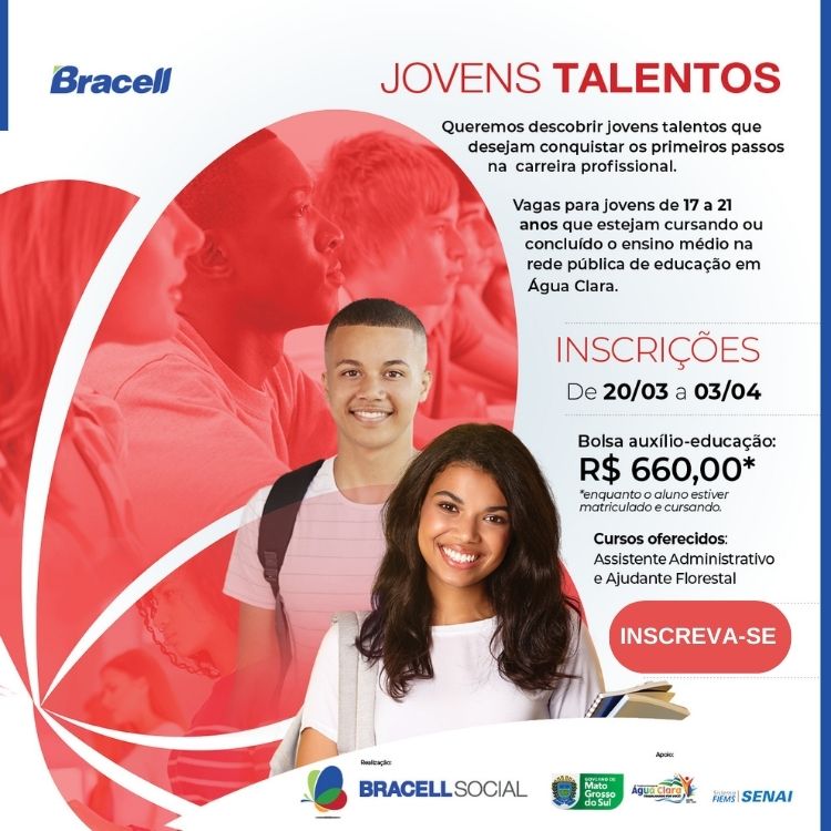 A Bracell, empresa do grupo RGE, líder global na produção de celulose solúvel e que está em expansão no interior de Mato Grosso do Sul, firmou parceria com a Secretaria Estadual de Educação (SED) para qualificar jovens de 17 a 21 anos que estão cursando o ensino médio ou que tenham concluído na rede pública da cidade de Água Clara, Mato Grosso do Sul. Outro critério para inscrição é que a renda da família não ultrapasse meio salário mínimo por pessoa.